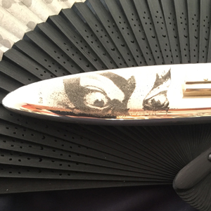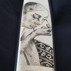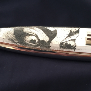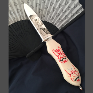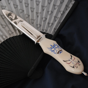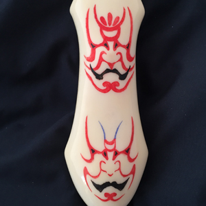 | 歌舞伎の隈取がテーマです。 顔に塗る”どうらん”の白い表現が ちょうどセイウチの牙に合っています。 贅沢に一番太い場所を使いました。 ハンドルの突起は 人間の「鼻」をイメージしています。 正面の突起の部分に隈取を スクリムショーで施しています。 ハンドル材の表裏の凸部分を鼻と見たてた 4つの隈取です。 表側の赤い隈取は 勇気や希望や正義や健康明るさ等、 前向きになる役柄に描かれるものです。 裏側には青色や紫などの悪や裏切り妖怪役等、 陰に潜む役柄に描かれるものを彫りました。 シースはエングレーブ(ブリノ)です。 点彫りと、背景の彫刻です。 隈取をメイクする歌舞伎役者です。 裏は役者さんが目に力を入れる 「にらみ」を彫りました。 光の反射で絵が浮かび上がってきます。 歌舞伎の隈取と、隈取をして演じる役者が 一つになった時、 その意味が舞台の上で完成される、 そう言う物語をこのナイフに込めてみました。 |